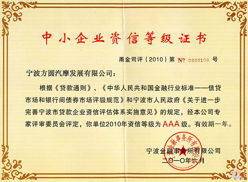 Ningbo Fangyuan was awarded small and Medium Enterprise Credit Rating AAA grade for the 4th time in 2010.it reflects Fangyuan strong capital capability and excellent management with great positive impact to foreign economic cooperation and capital operation. FY always attaching much importance on asset structure, financial status, cash flows optimization and the credit system construction AAA credit will continue improving our credibility to get more financial institutions support. A great power for Fangyuan’s future development